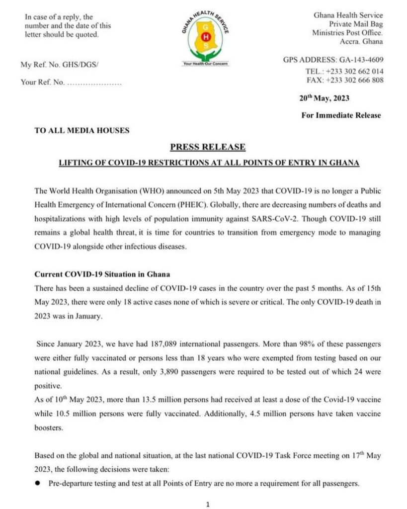 The GHS in its statement amongst others said, pre-departure testing and test at all points of entry are no more a requirement for all passengers, COVID-19 health declaration form for international travellers has been suspended.