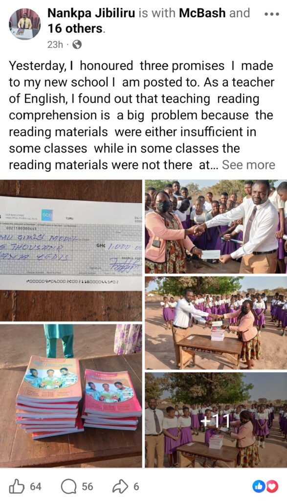 Mr. Alhaji Nankpa Jibirilu took to his Facebook handle to express a deep commitment to Tumu Girls Model School and pledged to continue making a positive impact.